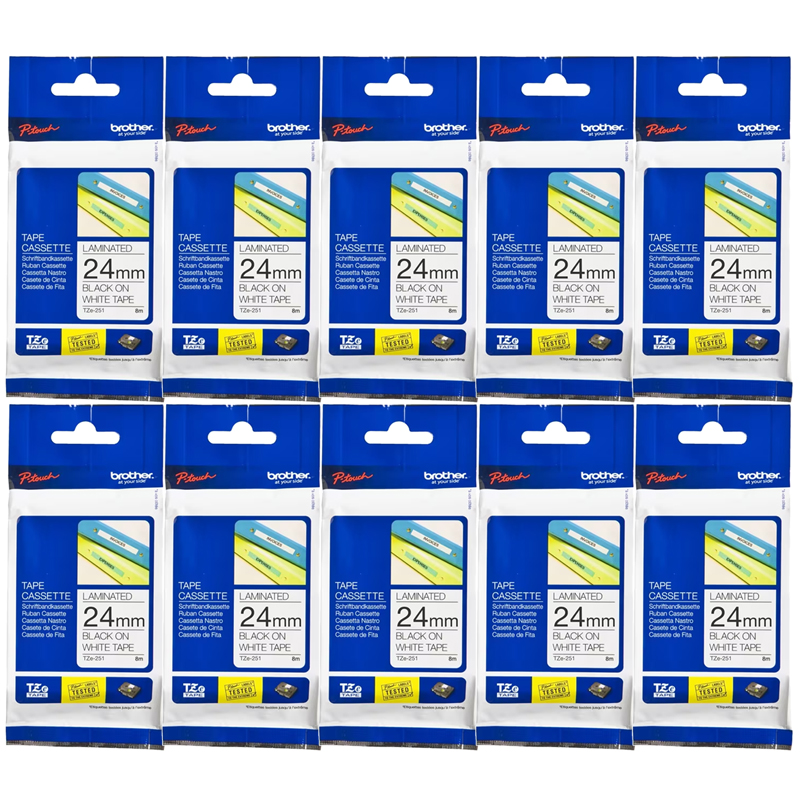 10 x Genuine Brother TZe-251 24mm Black on White Laminated Tape 8 metres