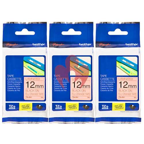 3 x Genuine Brother TZe-B31 12mm Black on Fluro Orange Laminated Tape 5 metres