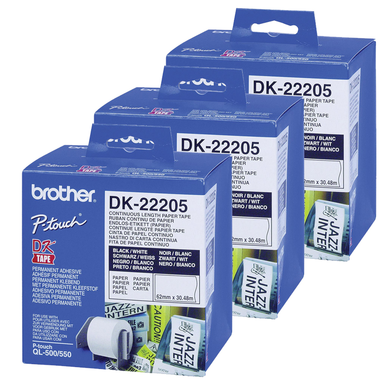 Buy High Standards and Low prices 3 x Genuine Brother DK-22205 White Paper Tape Roll - 62mm x 30.48m - Continuous Length here at HotToner and save! |