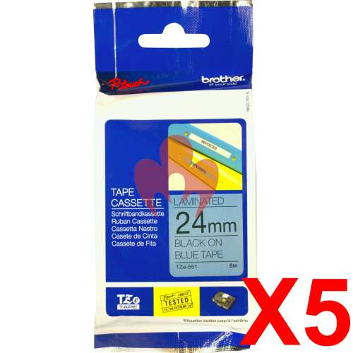 ![]() 5 x Genuine Brother TZe-551 24mm Black on Blue Laminated Tape 8 metres |
