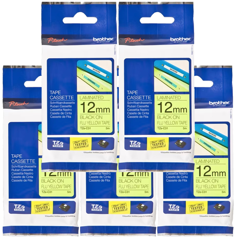 ![]() 5 x Genuine Brother TZe-C31 12mm Black on Fluro Yellow Laminated Tape 5 metres |