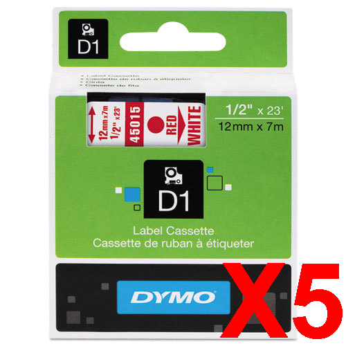 5 x Genuine Dymo D1 Label Tape 12mm Red on White 45015 - 7 metres
