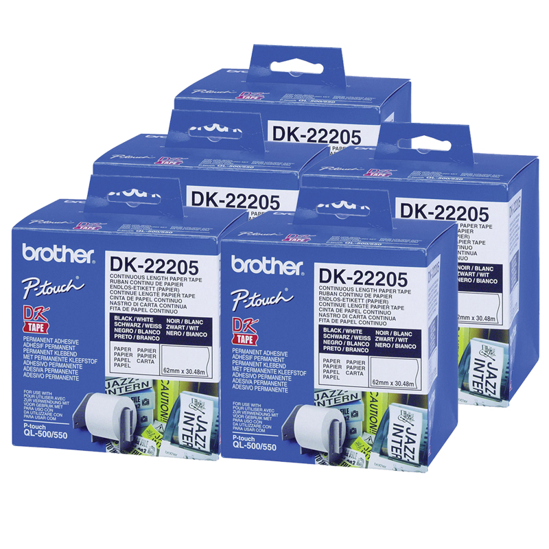 Buy High Standards and Low prices 5 x Genuine Brother DK-22205 White Paper Tape Roll - 62mm x 30.48m - Continuous Length here at HotToner and save! |