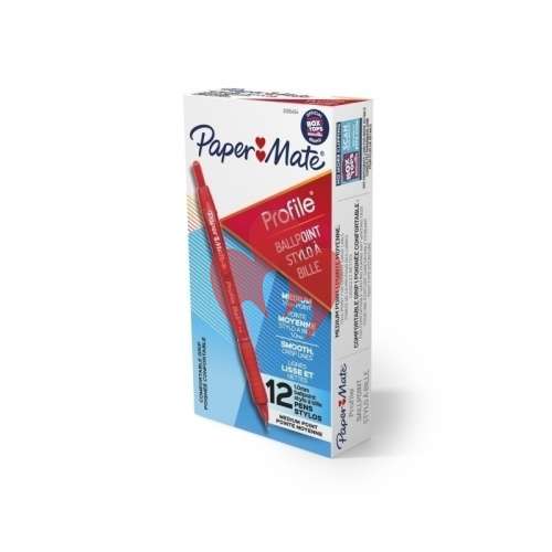 Paper Mate Profile Retractable Ball Point 1.0mm Red Box of 12 has a soft grip for comfortable everyday writing. Convenient retractable design and color-matching barrels.