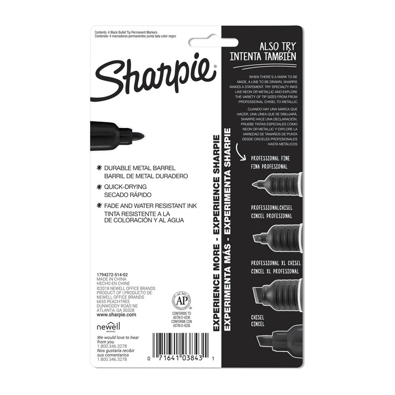 Sharpie Metal Permanent Marker Bullet Black Pack of 4 marks on wet and oily surfaces. Suitable for plastic, wood, stone, foil, metal, corrugate, and leather. Durable chisel tip and aluminum body. Ink is fade and water resistant.