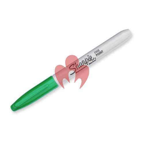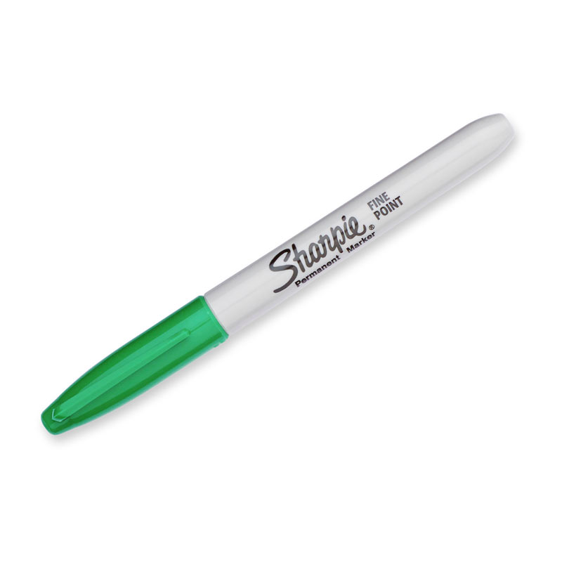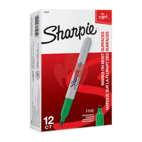 Sharpie Permanent Marker Fine Point Green Box of 12 features permanent ink that marks on paper, plastic, metal, and most other surfaces. Ink dries quickly and resists both fading and water. AP certified.